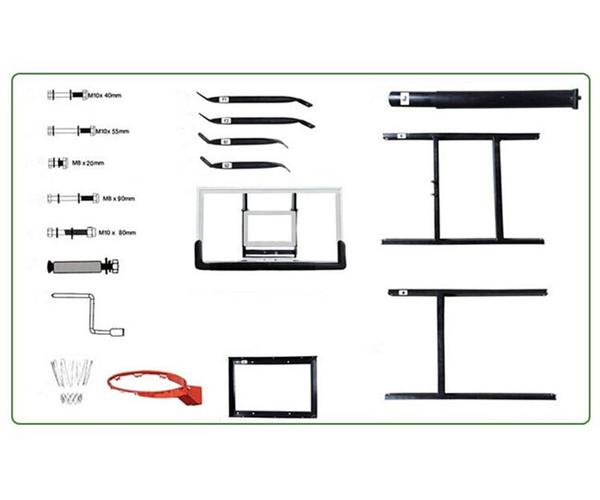 Крепится к стене (крепеж в комплекте). Предусмотрена регулировка по высоте с помощью рукоятки. Щит изготовлен из закаленного стекла и имеет толщину 10 мм. По внешнему канту имеет аллюминевую раму. В нижней части щита есть защитное покрытие (Poly pade). Стандартное кольцо диаметром 45 см, оранжевого цвета. В комплекте всепогодная нейлоновая сетка. Кольцо имеет 2 встроенных амортизатора и выдерживает нагрузку 220 кг в передней части.